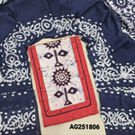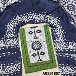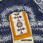 Mango yellow batik dyed soft cotton unstitched salwar material, thread& faux mirror work on yoke(lining needed)dark blue batik dyed cotton bottom, printed soft mul cotton dupatta. CODE AG251808