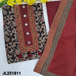 Designer Maroon base ajrak hand block printed pure cotton unstitched salwar material, real mirror work on yoke(lining optional)black cotton bottom, block printed full length mul cotton dupatta with tapings. CODE JL251812