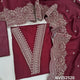 Maroon fancy silk cotton unstitched salwar material, V Neckline with zari detailing (Soft, Silky, Lining Needed) Matching Silky Bottom, Embroidered dupatta with scallop edges. NV252520