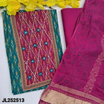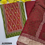 Dark maroon ikat printed jam cotton unstitched salwar material, kantha stitch& real mirror work on yoke(lining optional)mossy green spun cotton bottom, block printed fancy silk cotton short width dupatta with gold tissue pallu. CODE JL252512