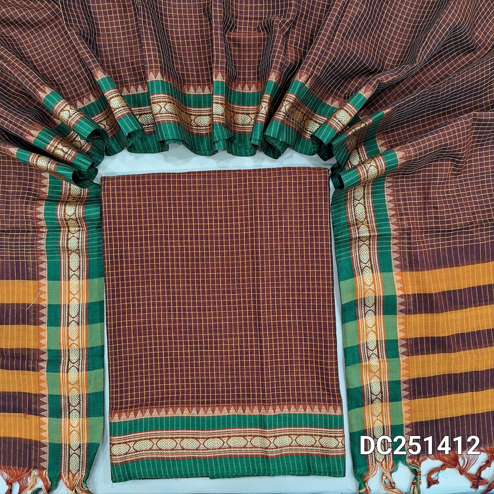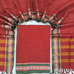 Maroon mercerised handloom cotton unstitched salwar material, checked all over, double side borders (Thin, Lining Needed) Fabric Measurement : 4.5 Metres, Full length dupatta. Note : Weaving Inconsistencies are not defects. DC251412