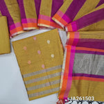 Maroon premium silk cotton unstitched salwar material (lining needed) zari buttas, zari lines allover, matching silk cotton bottom, dual shaded silk cotton dupatta with tissue pallu & tassels. JA261505