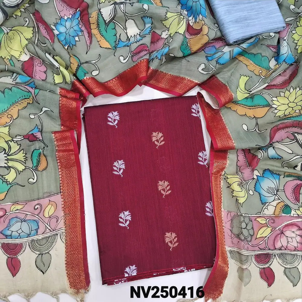 Maroon premium raw silk unstitched salwar material (textured, Lining Needed) thread woven buttas allover, silver grey silk cotton bottom, original pen kalamkari silk dupatta with zari borders. NV250416