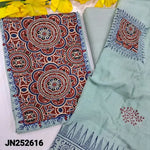 Mehandhi yellow block printed pure cotton unstitched salwar material, ajrak printed &real mirror work on yoke, cut work on front(lining needed)matching lining provided, NO BOTTOM, block printed pure mul cotton dupatta with patch work. CODE JN252614