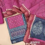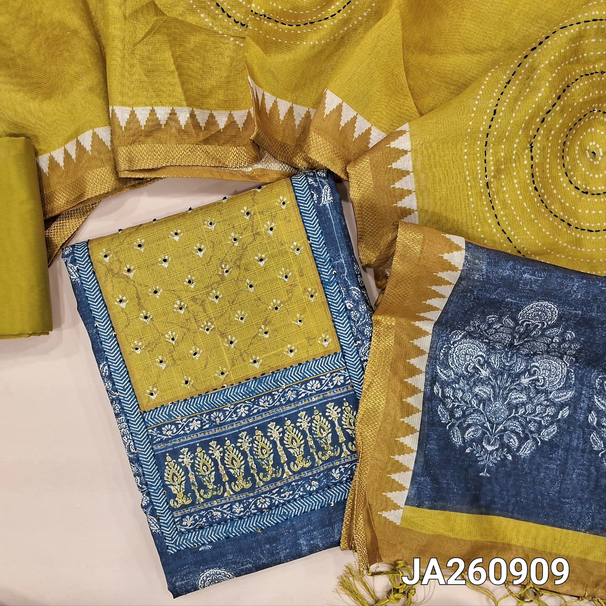 Mughal printed dark Blueish Grey jakard silk cotton unstitched salwar material (lining needed) embroidery, mehandhi yellow patch work on yoke, mehandhi Yellow silk cotton bottom, kantha stitch silk cotton dupatta printed pallu with tassels. JA260909