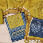 Mughal printed dark Blueish Grey jakard silk cotton unstitched salwar material (lining needed) embroidery, reddish maroon patch work on yoke, reddish maroon silk cotton bottom, kantha stitch silk cotton dupatta printed pallu with tassels. JA260911