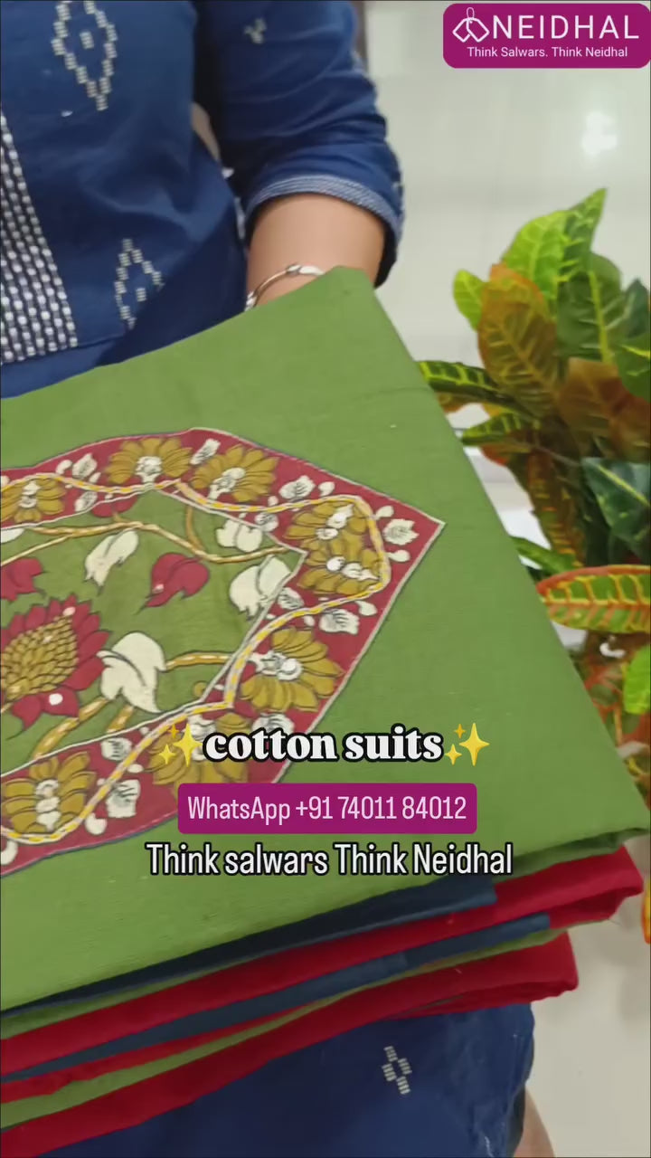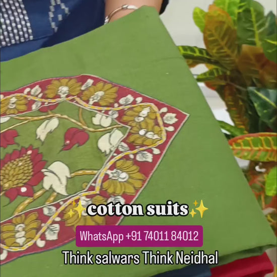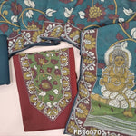 Olive green premium cotton unstitched salwar material, kalamkari printed yoke with sequins and kantha stitch detailing(lining optional)teal blue cotton bottom,kalamkari printed short width pure mul cotton dupatta. FB260705