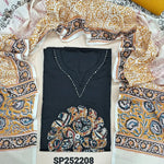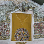Olive Green satin cotton unstitched salwar material, Kalamkari applique work on yoke and front with embroidery, Maroon drum dyed cotton bottom, block printed pure cotton dupatta. SP252207