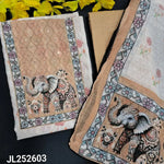 Pale pink digital printed semi linen unstitched salwar material, elephant printed yoke& daman with bead work(thin, lining needed)matching spun cotton bottom, digital printed semi linen dupatta with lace tapings. CODE JL252602