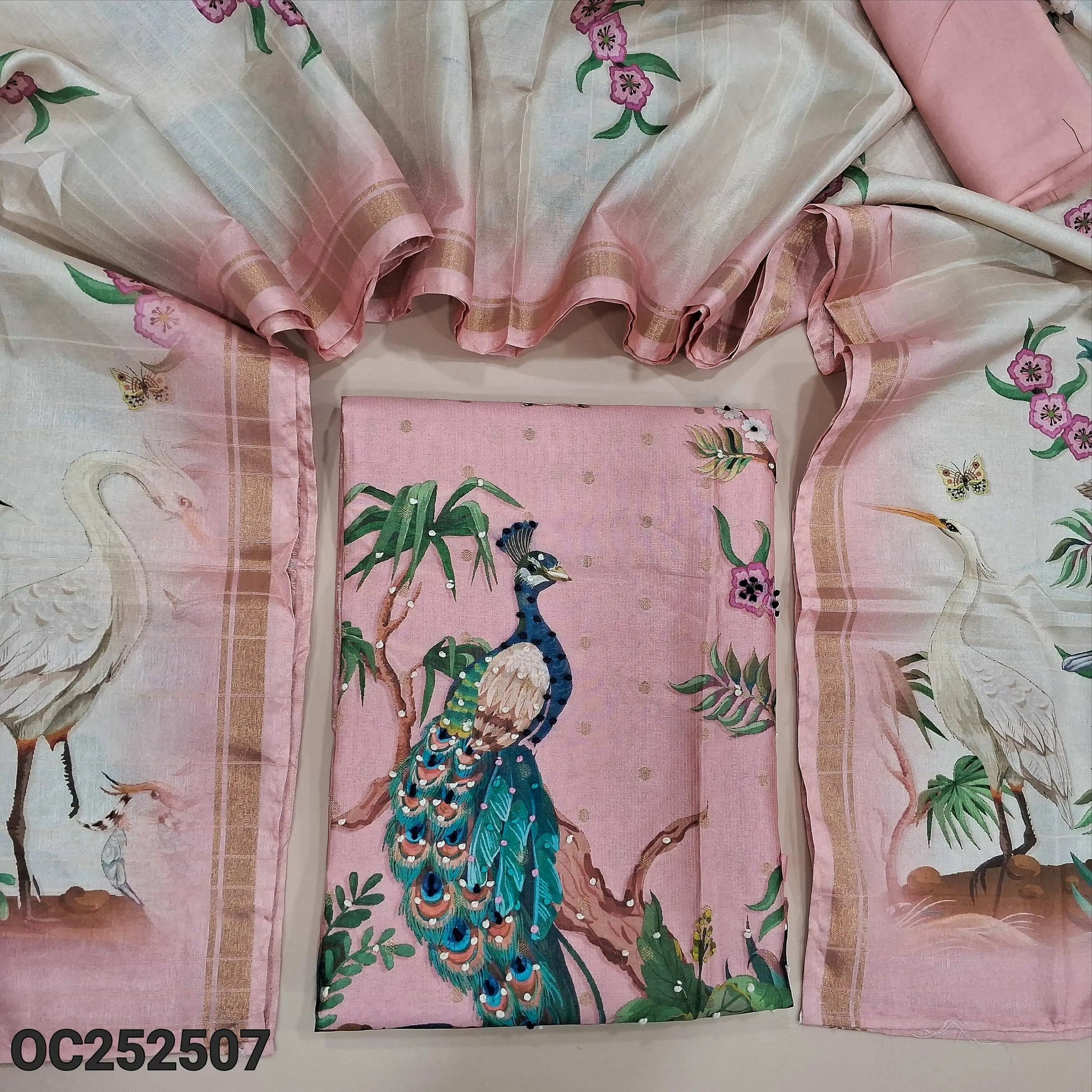 Pastel Pink fancy silk cotton unstitched salwar material,(thin, lining needed) digital print, hand embroidery work on daman, matching santoon bottom, dual shaded digital printed silk cotton full length dupatta. OC252507