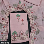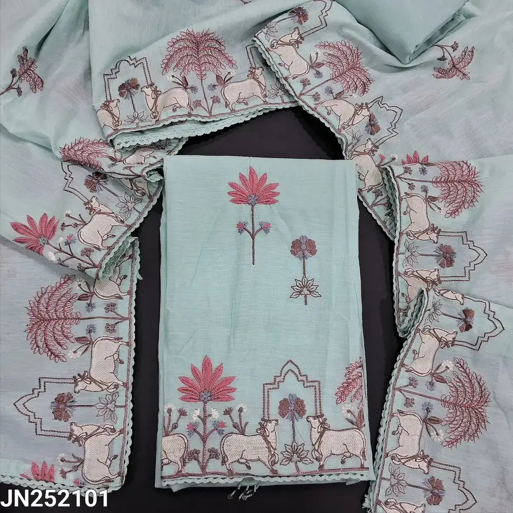 Pastel blue designer mul chanderi silk cotton unstitched salwar material, bead work on yoke, embroidered on front(thin, lining needed)matching santoon bottom, rich embroidered mul chanderi silk cotton dupatta with lace tapings. CODE JN252101