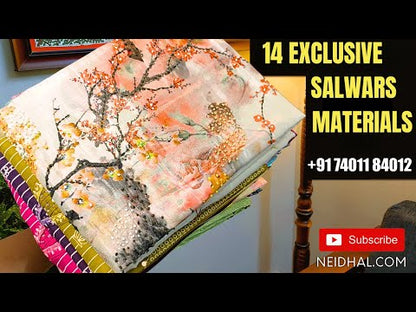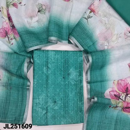 Pastel blue digital printed fancy silk cotton unstitched salwar material, self embroidered& sequins work on yoke(lining needed)matching silky bottom, floral printed semi linen short width dupatta with zari borders. CODE JL251609
