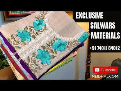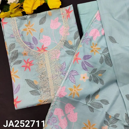 Pastel blue floral printed kantha cotton unstitched salwar material, embroidered &sequins work on yoke(lining needed)matching drum dyed cotton provided for lining, NO BOTTOM, floral printed soft silk cotton dupatta. CODE JA252711