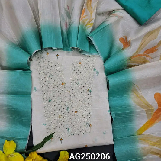 Pastel blue floral printed semi linen unstitched salwar material, deer printed with zari& zardozi work on yoke(thin, lining needed)matching spun cotton bottom, printed semi linen dupatta with kota lace tapings. CODE AG250101