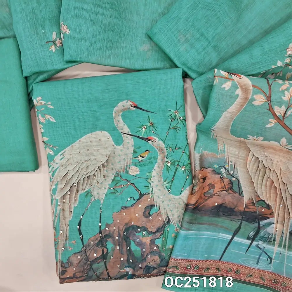 Pastel Blue premium silk cotton unstitched salwar material (thin, lining needed), digital printed, sequence, bead work on front, matching santoon bottom, digital printed premium silk cotton dupatta. OC251818