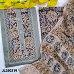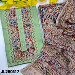 Pastel blue satin cotton unstitched salwar material, real mirror work(lining optional)kalamkari hand block printed pure cotton bottom, kalamkari hand block printed pure mul cotton full length dupatta with lace tapings. CODE JL250320