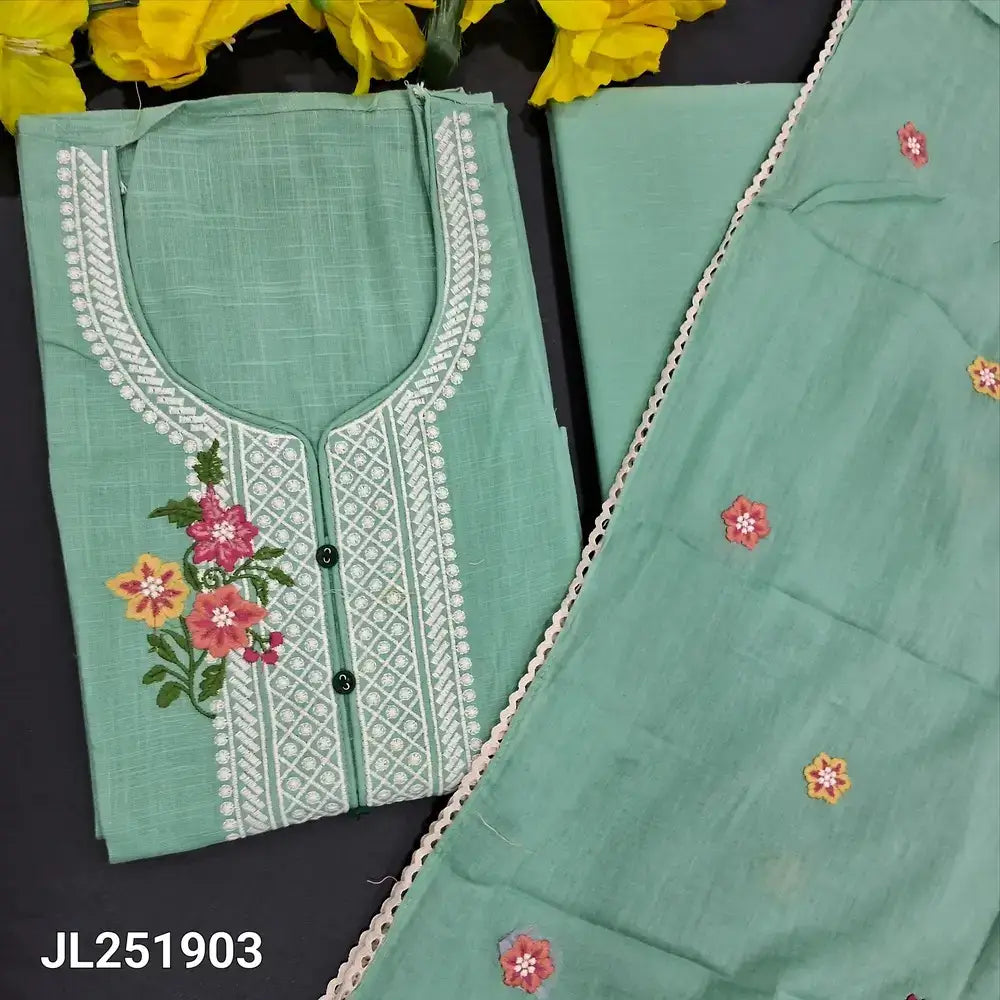 Pastel blue slub cotton unstitched salwar material, embroidered on yoke(lining needed)matching drum dyed fabric provided for lining, NO BOTTOM, embroidered pure mul cotton dupatta with lace tapings. CODE JL251903