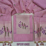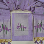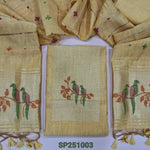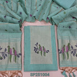 Pastel green designer jamdani woven premium silk cotton unstitched salwar material, paithani weaving on yoke(lining needed)matching silk cotton bottom, jamdani woven premium silk cotton dupatta with paithani weaving pallu. CODE SP251005