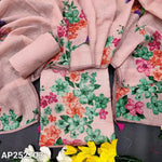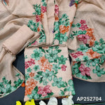 Pastel green digital printed pure linen unstitched salwar material, hand embroidered on front, printed v neck(lining needed)matching santoon bottom, digital printed pure linen dupatta with hand embroidered. CODE AP252701