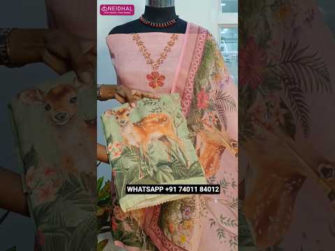 Pastel green with golden tint tissue linen unstitched salwar material, v neck with zari work, deer design with zari& zardozi work on daman(thin, lining needed)matching santoon bottom, digital printed tissue linen dupatta with lace tapings.. CODE AG251907