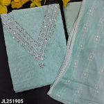 Pastel peach fancy kota silk cotton unstitched salwar material, v neck with faux mirror work, self embroidered all over(thin, lining needed)matching silky bottom, embroidered fancy chiffon dupatta with sequins& lace work. CODE JL251907