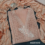 Pastel pink crinkled jimmy choo with silver tint unstitched salwar material, lace work on yoke, rich cut work on panel pattern(thin, lining needed)matching silky bottom, brush painted chiffon dupatta with lace tapings. CODE AG251611
