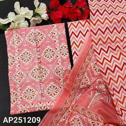 Pastel pink printed pure cotton unstitched salwar material, potli buttons& faux mirror work on yoke(lining optional)zigzag printed cotton bottom, printed pure cotton full length dupatta. Code AP251209