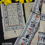 Pastel pink semi gicha unstitched salwar material, warli printed &faux mirror work on yoke(thin, lining needed)matching cotton bottom, warli printed semi gicha dupatta. Code JL252201