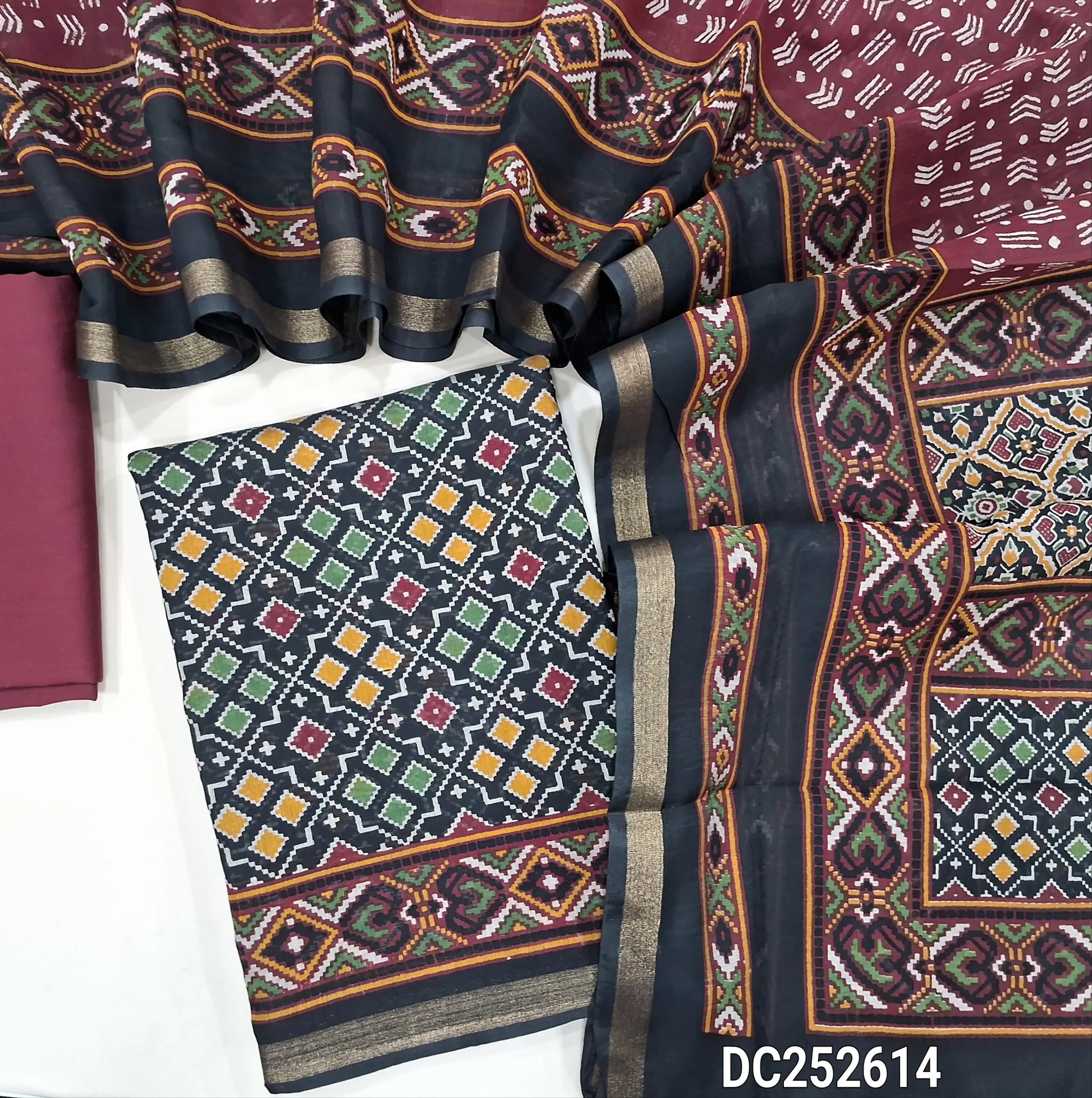Premium Black premium silk cotton unstitched salwar material (lining needed) patola printed allover, maroon spun cotton bottom, patola printed premium silk cotton dupatta. DC252614