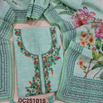 Pastel peach premium linen unstitched salwar material(textured, lining needed) rich hand embroidery work on front, matching santoon bottom, digital floral printed, hand embroidery work on linen dupatta. OC251018