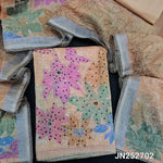 Peachish pink digital printed semi linen unstitched salwar material, fancy buttons &lace work on yoke, zardozi& sequins work on daman(thin, lining needed)matching cotton bottom, digital printed semi linen dupatta with lace tapings. CODE JN252704