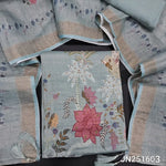 Designer peachish pink digital printed tissue linen unstitched salwar material, v neck, rich hand embroidered on yoke& daman(lining needed)matching spun cotton bottom, digital printed tissue linen dupatta with tissue borders CODE JN251604