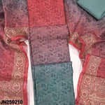 Peachish pink& green dual shaded leafy printed textured silk cotton unstitched salwar material(thin fabric, lining needed)green silky bottom, digital printed dual shaded fancy silk cotton dupatta. CODE JN250209