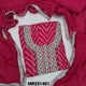 Dark pink bandhini printed premium organza unstitched salwar material, heavy thread& bead work on yoke, lace work on daman(thin fabric, lining needed)matching spun cotton bottom, pure chiffon dupatta with lace tapings. CODE MR251401