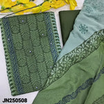 Dark &light pink block printed semi georgette unstitched salwar material, panel pattern on front(thin fabric, lining needed)matching silk cotton bottom, block printed dual shaded fancy chiffon dupatta. CODE JN250506