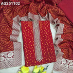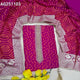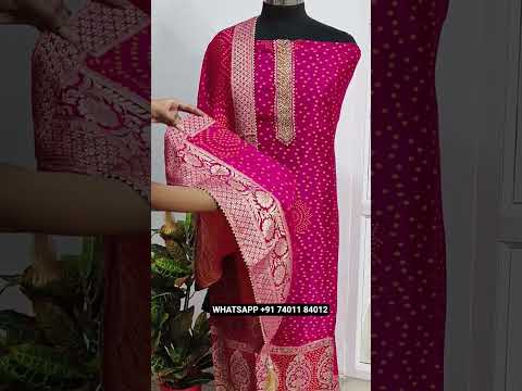 Bright pink designer pure dola silk unstitched salwar material, heavy work on yoke, thread weaving all over, rich daman(lining needed)matching santoon bottom, bandhini woven design full length dupatta with zari borders. CODE AG251103