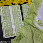 Pink floral printed cotton unstitched salwar material, lace work on yoke(lining optional)printed cotton bottom, block printed dual shaded chiffon dupatta with lace tapings. CODE JL250715