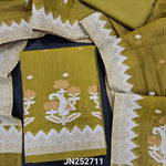 Pink jamdani woven silk cotton unstitched salwar material, thread& zari buttas on front(thin, lining needed)matching spun cotton bottom, jamdani woven silk cotton dupatta with thread& zari weaving borders. CODE JN252712