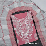 Pink pure cotton unstitched salwar material, chikankari embroidered on front(lining optional)self embroidered cotton bottom, embroidered pure mul cotton dupatta with scallop edged. CODE AG252607
