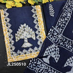 Bright pink original wax batik dyed jakard cotton unstitched salwar material, hand embroidered on yoke(lining needed)dark blue batik dyed cotton bottom, batik dyed pure kota cotton full length dupatta(REQUIRES TAPING). CODE JL250508