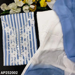 Pink& white striped premium cotton unstitched salwar material, real mirror& applique work on yoke(lining needed)half white schiffli embroidered cotton bottom, dual shaded fancy chiffon dupatta with tapings. Code AP252001