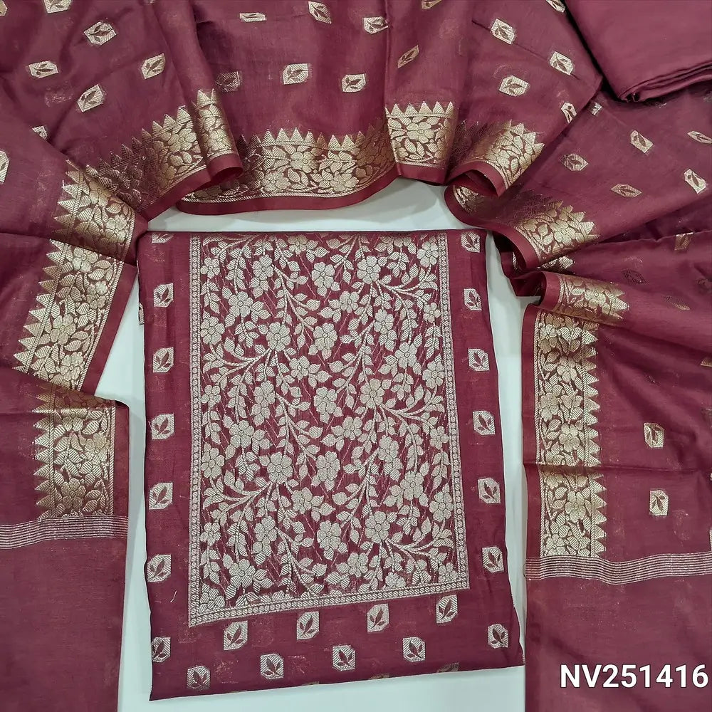 Pinkish maroon fancy silk unstitched salwar material(silky, lining need)zari woven on yoke, zari weaving all over, matching silky bottom, benarasi weaving buttas on soft silk cotton dupatta with borders. NV251416