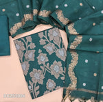 Premium Benaras woven mehandhi Yellow soft silk cotton unstitched salwar material (lining needed) heavy daman work, matching silky bottom, zari buttas on soft silk cotton dupatta with benaras woven borders. DC253003