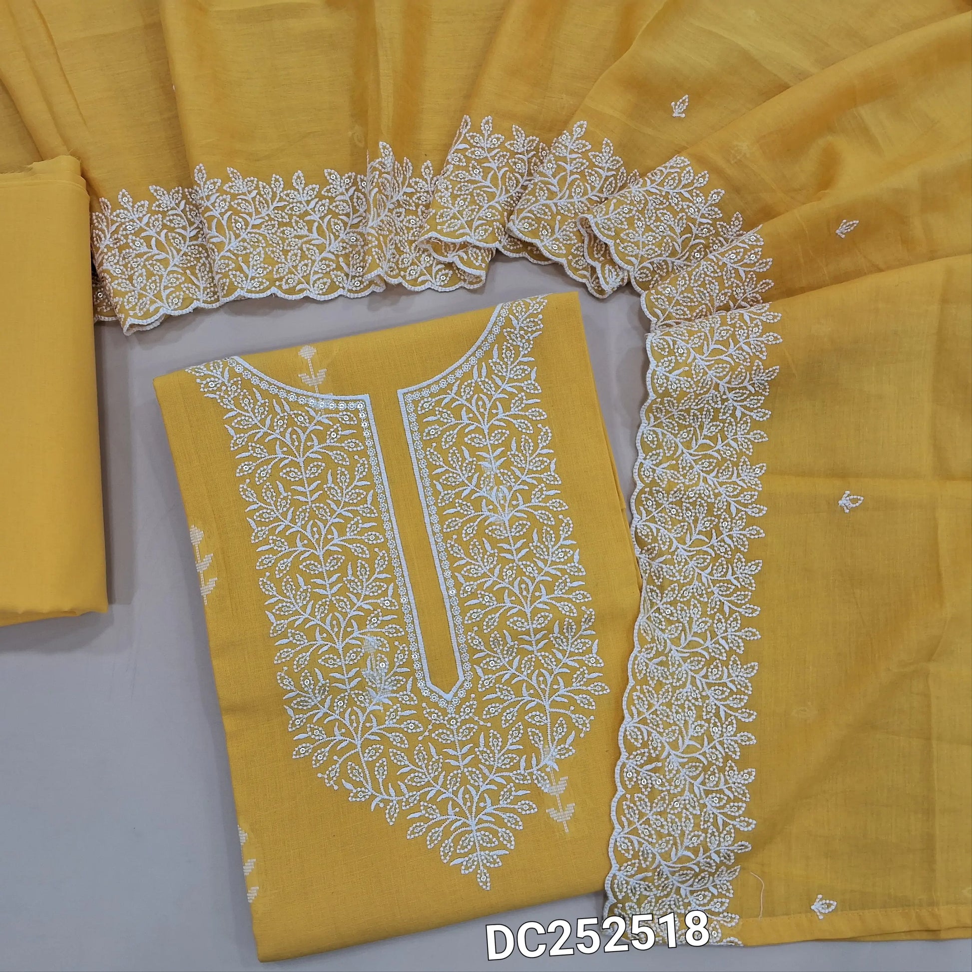 Premium bright Yellow soft pure cotton unstitched salwar material (lining needed) embroidery work on front, matching soft cotton bottom, embroidery work on soft mul cotton short width dupatta. DC252518