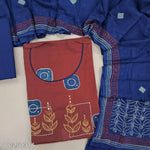 Block printed Black cotton unstitched salwar material(lining optional) embroidery work on yoke, blue cotton bottom, printed jakard cotton dupatta. DC250315