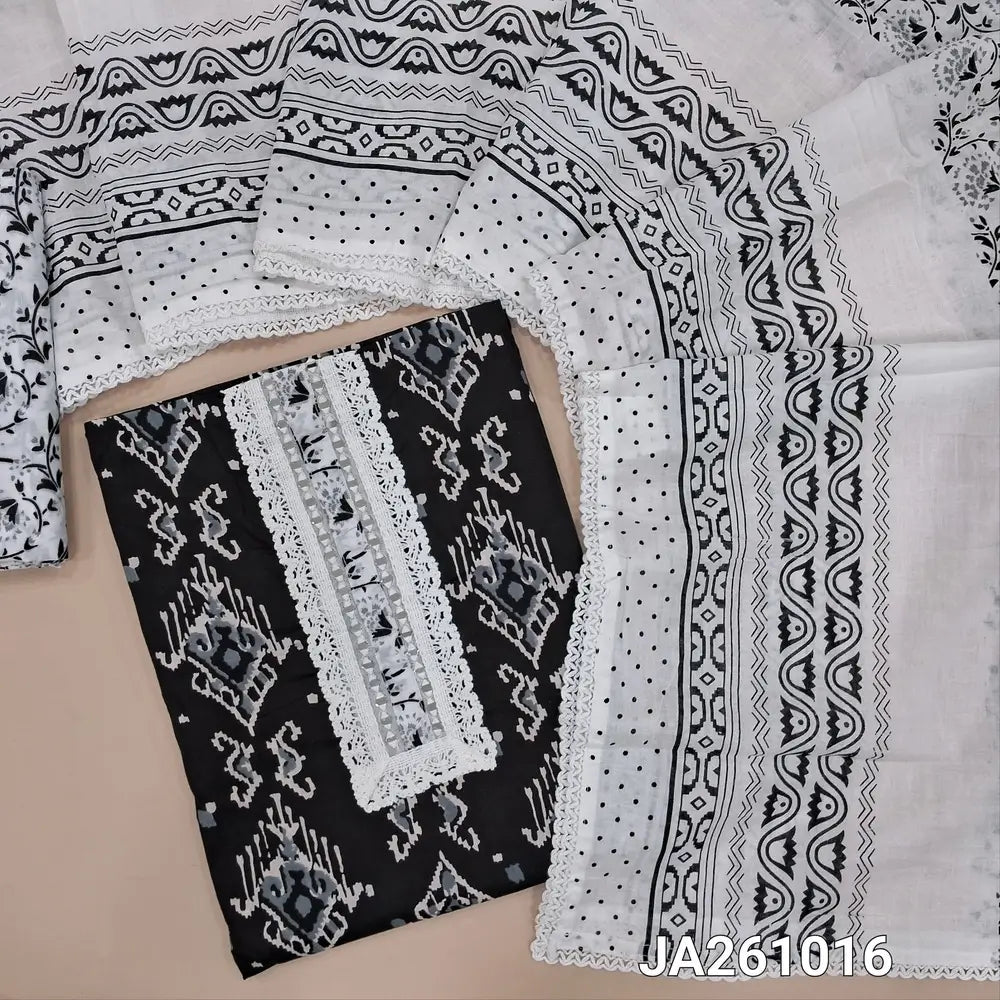 Printed Black soft cotton unstitched salwar material, (lining optional) real mirror, lace work on yoke, printed cotton bottom, printed cotton dupatta with lace tapings. JA261016