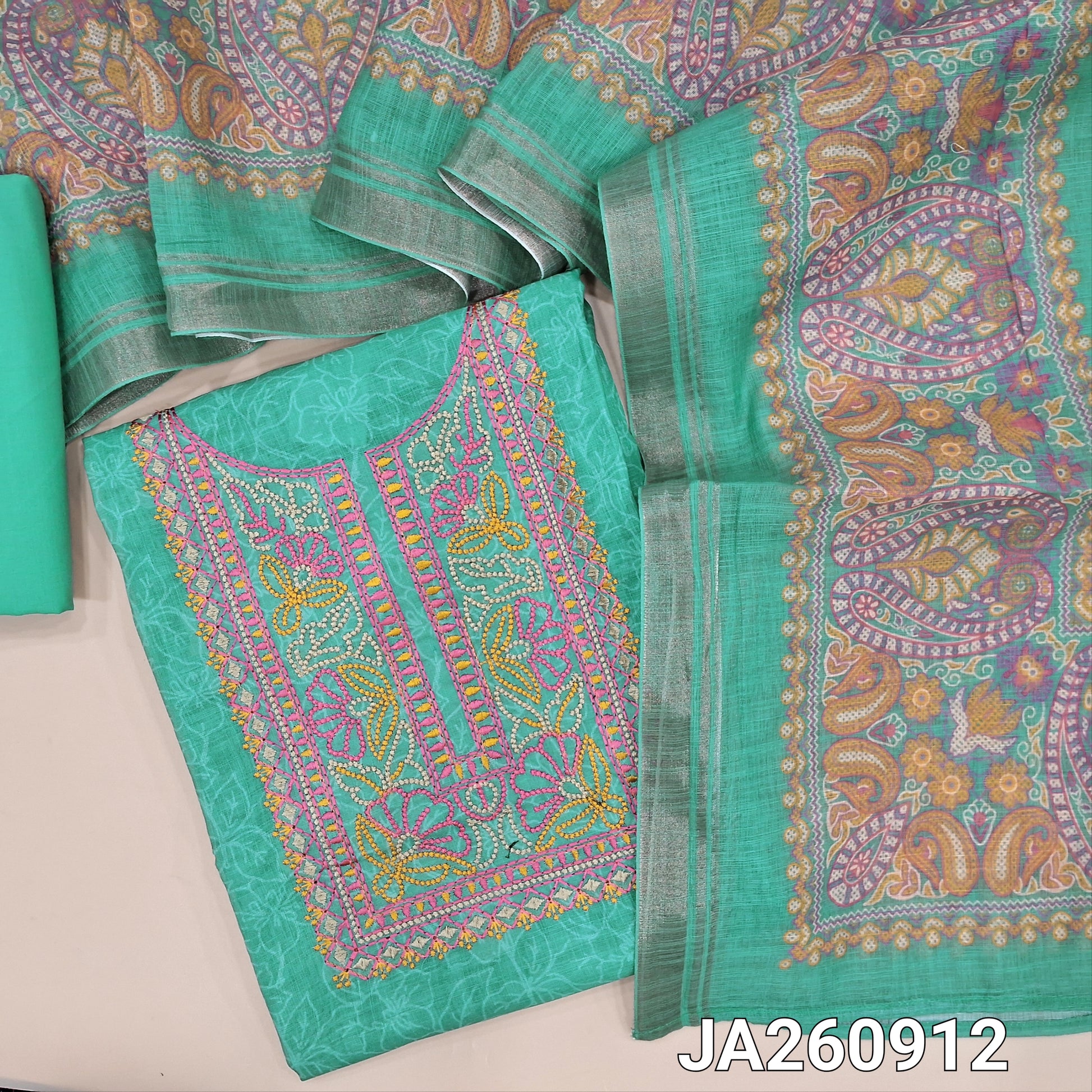 Printed pastel Blue semi linen unstitched salwar material, embroidered on yoke(lining needed) matching cotton bottom, digital colorful printed semi linen dupatta with tissue borders. JA260912