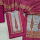 Printed peachish pink jute silk unstitched salwar material (Lining needed) sequins work on yoke, matching spun cotton bottom, printed jute silk dupatta. NV252908