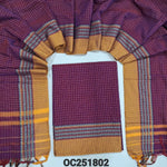Purple south mercerized handloom cotton unstitched salwar material(thin, lining needed) checked allover with contrast traditional thread woven border, bottom included with top, checked mercerized handloom cotton dupatta with tassels. OC251802