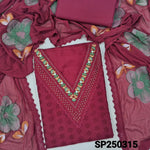 Bright purple schiffli embroidered cotton unstitched salwar material, v neck with thread& sequins work(lining needed)matching cotton bottom, brush painted fancy chiffon dupatta with lace tapings. CODE SP250312